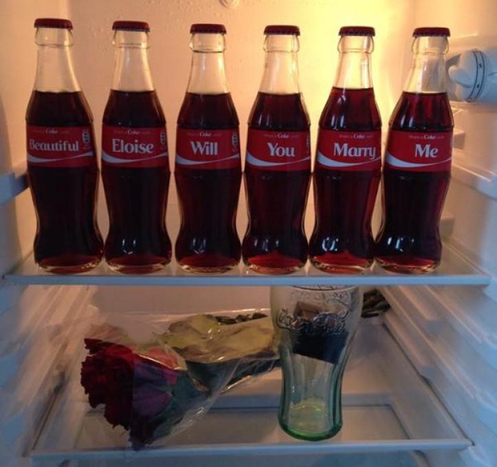 Hablamos por ejemplo de este chico que hace unos días etiquetó a Coca-Cola en la foto donde se veían varias botellas con el mensaje “Preciosa Eloise quieres casarte conmigo” Un ramo de flores y la caja con el anillo en un vaso. Él quería agradecer a la marca la ayuda por haberle hecho las botellas para pedir matrimonio a su novia, que por cierto dijo que sí.